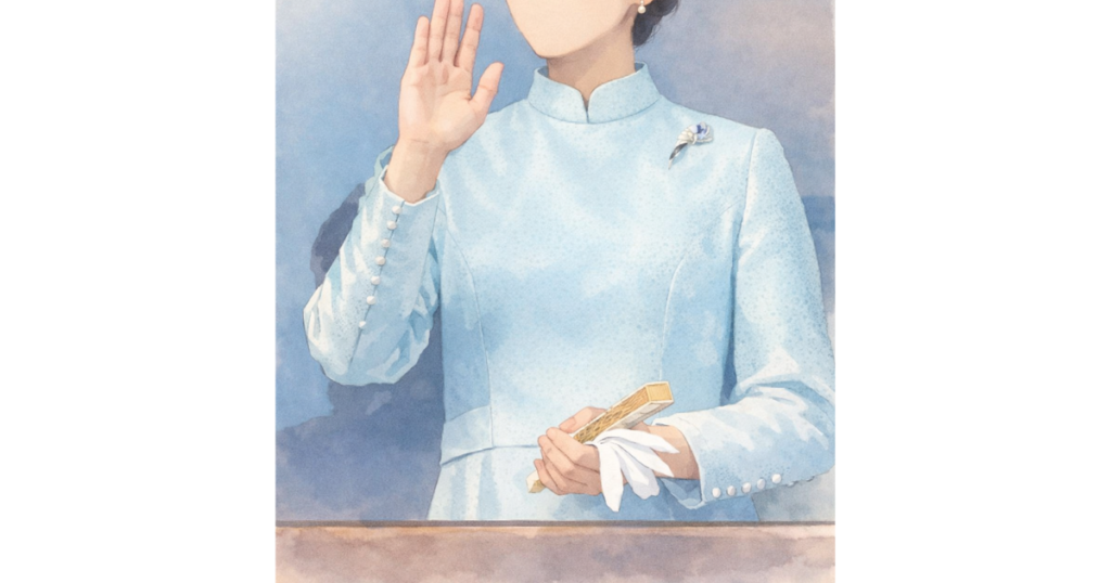 「水色」という色選びそのものが、愛子さまの立ち位置を象徴しているようで、水色は目立ちすぎず、けれど確実に視線を集める色。今回の水色のドレスは、色味だけでなく「場に対する配慮」が感じられる装いだった点も印象的でした。新年一般参賀は、多くの皇族方が横一列に並ばれる特別な場です。その中で、愛子さまの淡い水色は主張しすぎることなく、全体の調和を崩さない役割を果たしていました。