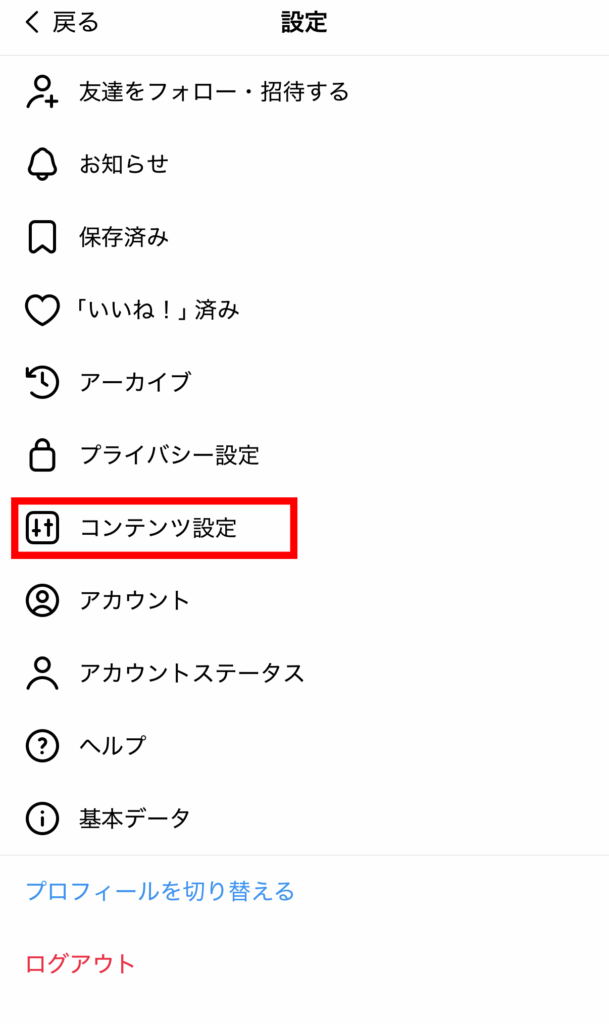 ② 「設定」→「コンテンツ設定」の順にタップする